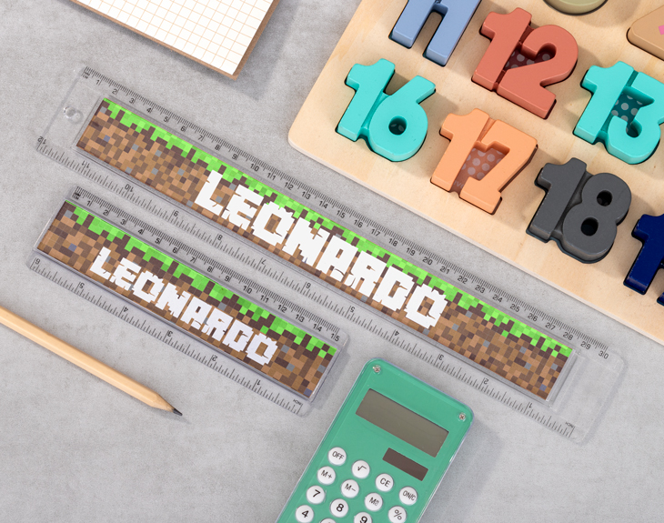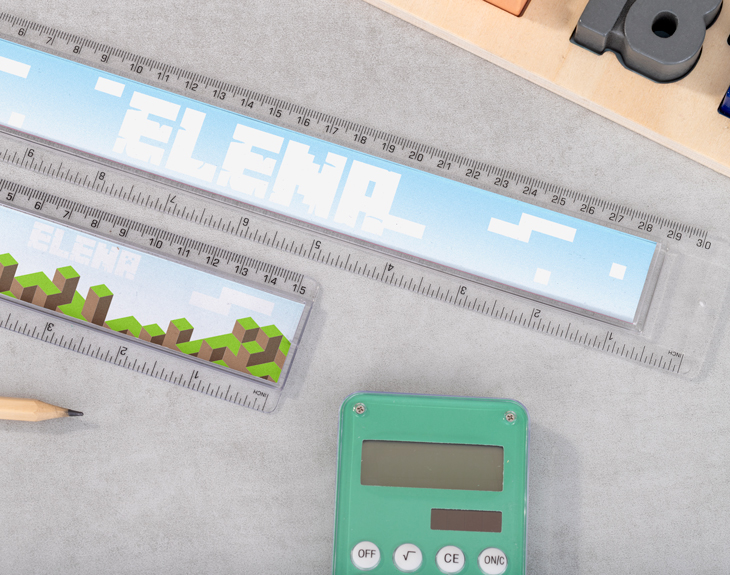 La creatividad de Minecraft ahora también puede formar parte del cole. Este pack de reglas escolares transparentes, con un diseño inspirado en el mundo pixelado más famoso, es perfecto para pequeños constructores y aventureros que no se separan de sus bloques ni en clase. Incluye dos reglas transparentes: una de 30 cm, ideal para tareas más largas y detalladas, y otra de 15 cm, perfecta para guardar en la mochila o el estuche. Pero lo mejor de todo es que podrás personalizar este diseño con el nombre de tu hijo o hija. Las texturas pixeladas y los motivos recuerdan a los escenarios, personajes y objetos del juego: espadas, bloques, creepers ¡y mucho más! Ya no habrá confusiones ni pérdidas: cada regla será como un objeto encantado en su mundo Minecraft. Y personalizar este pack será casi tan divertido como jugar. Solo tienes que añadir el producto al carrito y acceder a nuestro diseñador online, donde podrás escoger entre dos fondos para añadir el nombre de tu peque. Se convertirá en el material escolar más original de la clase. Medidas: Grande: 31 x 5 cm Pequeña: 16 x 4,7 cm Material: plástico transparente.