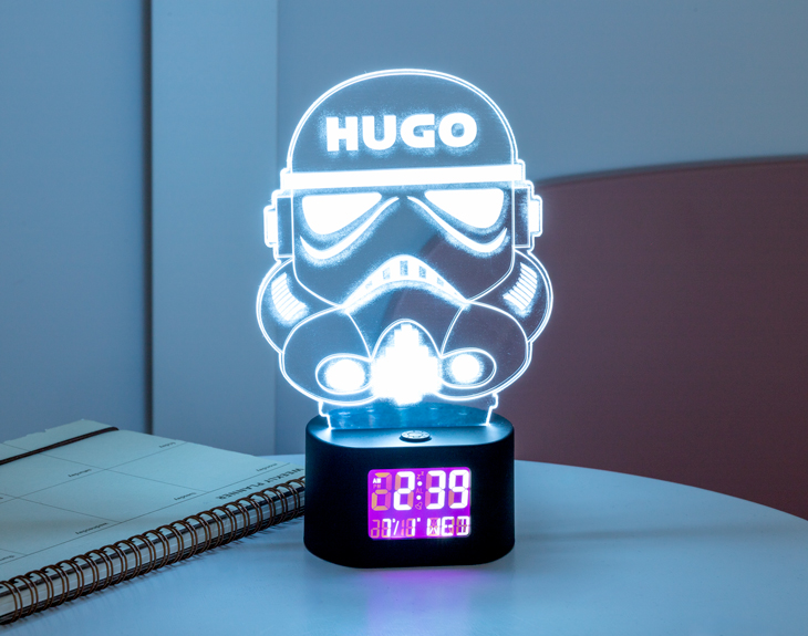 Todo fan de Star Wars que se precie tiene que tener este reloj-despertador personalizado en su mesilla de noche. Ni más ni menos que un abrumador soldado imperial (o stormtrooper), con tu nombre grabado en la frente de su casco. Además, se ilumina y cambia de color, por lo que nunca te aburrirás de este reloj-despertador. ¡Que la fuerza os acompañe cada mañana! Importante: el propio reloj te dará la posibilidad de elegir el color de las luces. Si pulsas una vez te saldrá un color, si pulsas de nuevo, aparecerá otro, y así sucesivamente. También podrás elegir la opción intermitente: ¡todas las luces creando un festín de colores! Medidas aproximadas de la base: 8,5x7,5x5cm. Importante: puedes encenderlo usando pilas (para poner en marcha el reloj) y conectándolo a la luz (para que se ilumine). Importante: la pantalla del reloj muestra la hora ininterrumpidamente, y tiene un botón “light zzz” para que se encienda la luz durante unos pocos segundos. Importante: pilas no incluidas. Puedes encenderlo usando pilas (para poner en marcha el reloj) y conectándolo a la luz (para que se ilumine).