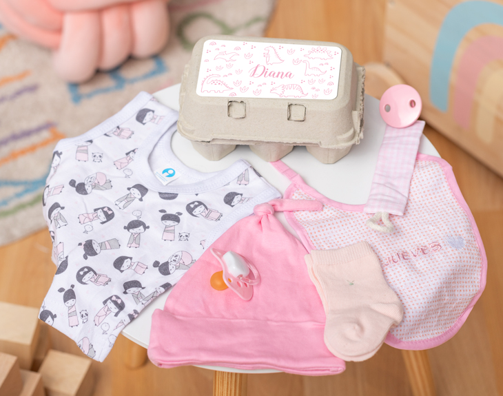 • Huevera classic personalizada. • 1 Chupete. • 1 Sujeta chupetes con cinta. • 1 Camiseta de tirantes. • 1 Gorrito. • 1 par de calcetines. • 1 Babero. • Tarjeta Recordatoria.
