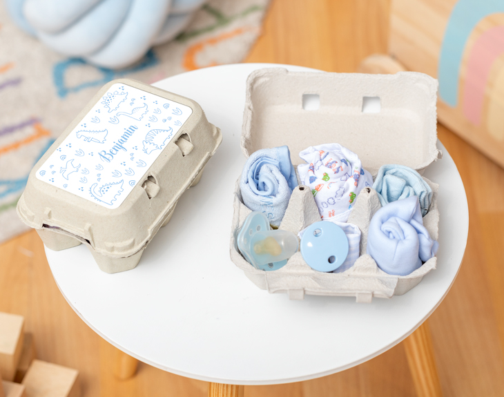Cuando nace un bebé es todo alegría en la familia y se vuelve la personita más importante del mundo. Y como hay que consentir a los peques de la casa, hazlo con esta huevera personalizada. Un regalo único que incluye en su interior una selección de pequeñas cositas para que el bebé las estrene en sus primeros meses de vida. ¡Dejarás a sus padres sin palabras! Este original regalo es perfecto para triunfar en cualquier ocasión y sorprender a los papis de ese bebé que acaba de llegar al mundo. Dale a esta huevera un uso diferente y descubre lo que se esconde en su interior: un chupete, un sujeta chupetes, un gorrito, una camiseta de tirantes, unos calcetines y un babero. ¡Todo de color azul! Pero si quieres que este regalo sea único, no te olvides de personalizar la huevera. Añade el producto al carrito y entra en el área de personalización. Completa el adorable diseño de dinosaurios azules con el nombre del pequeño y nosotros nos encargamos del resto. ¡Será el regalo más bonito del mundo! Medida: 18 cm x 12 cm. Talla: 0-3 meses.