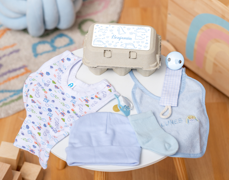 • Huevera classic personalizada. • 1 Chupete. • 1 Sujeta chupetes con cinta. • 1 Camiseta de tirantes. • 1 Gorrito. • 1 par de calcetines. • 1 Babero. • Tarjeta Recordatoria.
