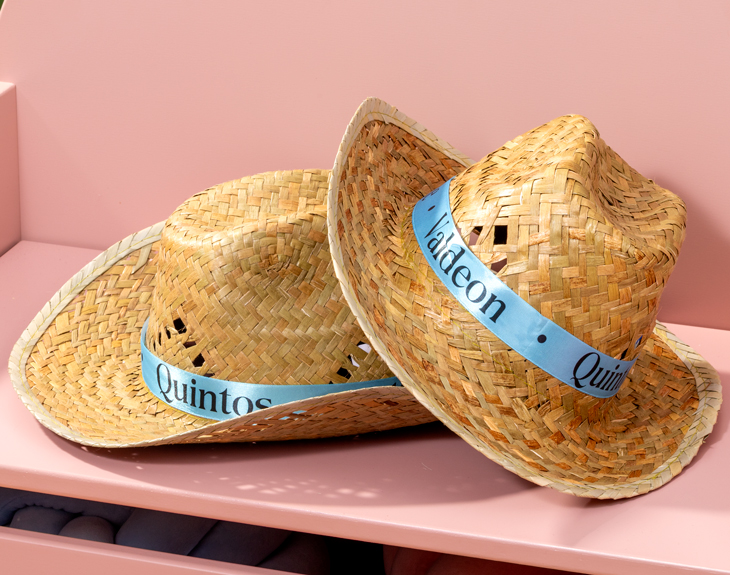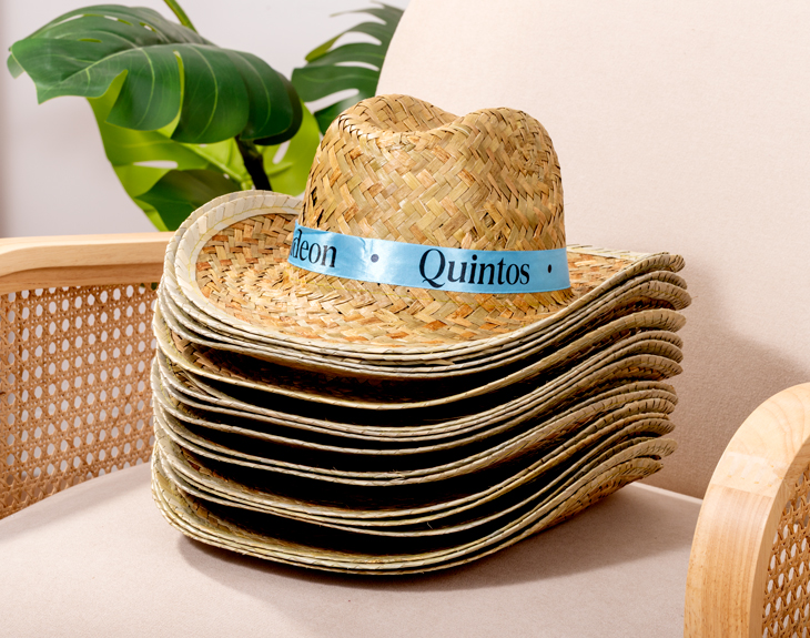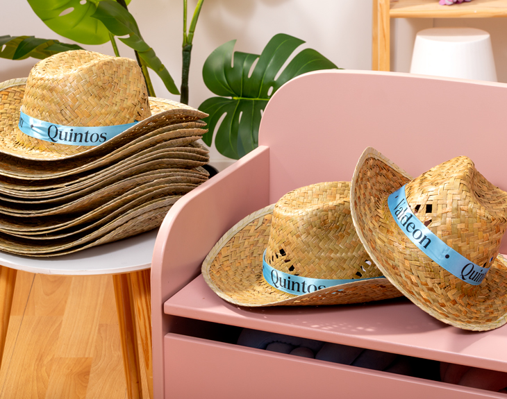 • Sombrero de paja con cinta personalizada. • Tarjeta recordatoria.