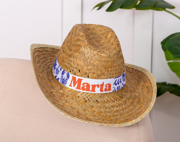 • Sombrero de paja con cinta personalizada. • Tarjeta recordatoria.