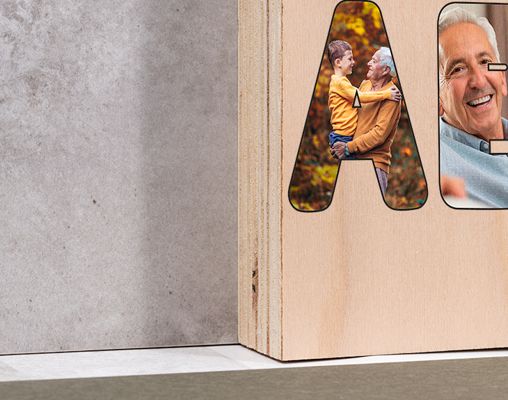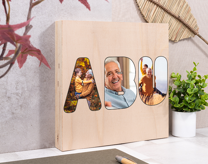 No hay regalo más emotivo y maravilloso que el que le hace un nieto a un abuelo o una abuela. ¿Quieres convertirte en el mejor nieto o nieta del mundo? Te lo ponemos muy fácil con esta tabla de madera. Lo único que tienes que hacer es elegir tres o más fotos divertidas con los abuelos y diseñar cada una de las letras de la palabra ABU, tal y como se puede observar en la imagen superior. Imagina el salón de tu abuela o abuelo decorado con esta preciosa y única tabla de madera personalizada.