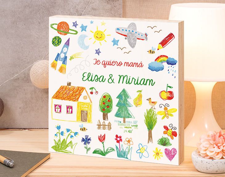 ¿Quieres emocionar a tu madre de verdad? Con esta tabla de madera personalizada recordará los preciosos dibujos que le hacíais de pequeños y volverá a sentir esa ilusión y esa alegría que sentía cuando llegabais del cole cargados de dibujos. Basta con que nos digas el texto que quieras insertar en el diseño y haremos el regalo más original y especial para sorprender a tu madre en cualquier fecha señalada. Es una gran idea para que sea aún más feliz en el día de su cumpleaños o en el Día de la Madre. Importante: Las maderas tienen vetas y estas quedan reflejadas en la imagen.