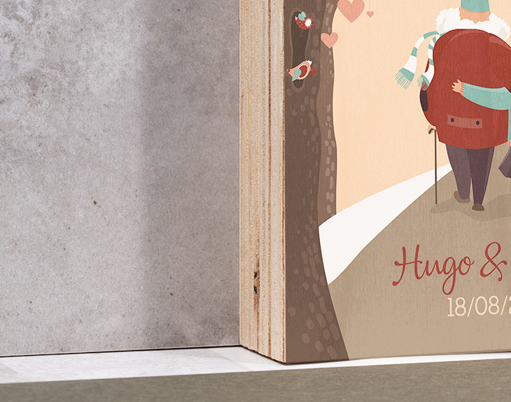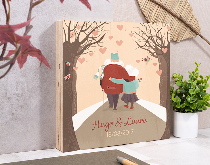Nuestratabla de madera más tierna. Conserva todo tu amor hasta el fin de vuestros días, como dos ancianos que se quieren tanto o más que el primer día. Qué bonito es llegar a los 80-90 años e ir agarrado todavía con tu pareja por la calle. Dinos los nombres y un texto o fecha para la parte inferior, y dale una sorpresa a tu novia o novio. Importante: Las maderas tienen vetas y estas quedan reflejadas en la imagen.