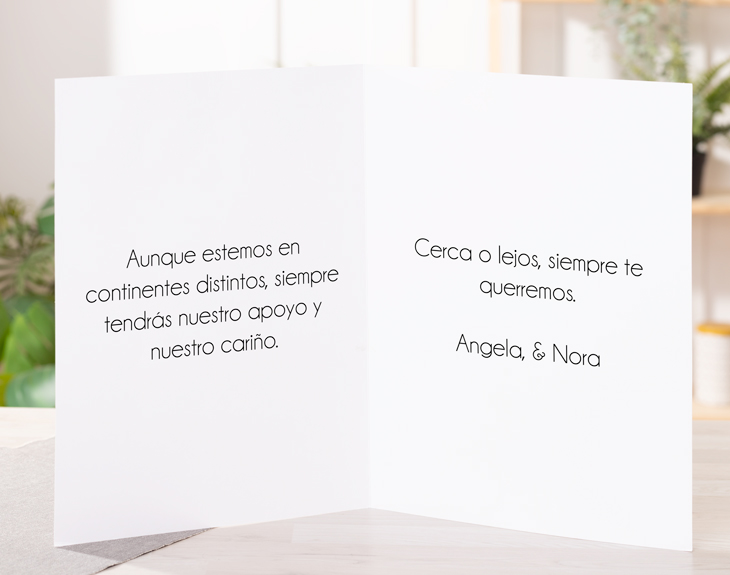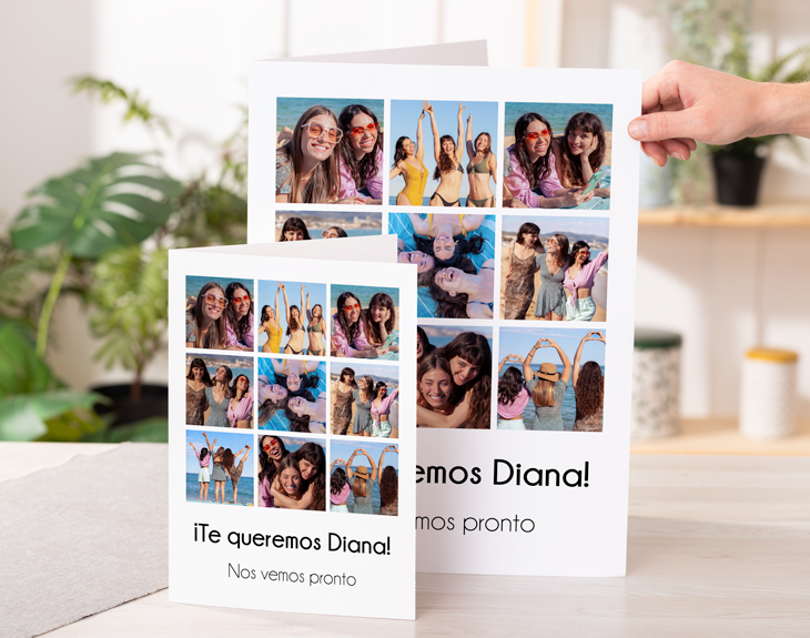 ¿Te has quedado sin ideas de qué regalar? ¿No quieres comprar lo típico que regala todo el mundo? No te preocupes porque si hay algo que puedes regalar en cualquier ocasión es una tarjeta personalizada tan guay como esta. Y es que al final, sorprender a la otra persona con vuestros mejores recuerdos es l amejor forma de decirle lo importante que es para ti y cuanto la quieres. No lo pienses más y regala esta original tarjeta en un cumpleaños, una despedida, en el amigo invisible, en Navidad... ¡Cuando tú quieras! Pero espera que hay más, porque además del diseño que tiene la tarjeta que es súper guay, podrás elegir el tamaño que más te guste (A4 o gigante) y también si quieres personalizar únicamente el exterior o también añadir un mensaje en el interior para hacerlo más especial. ¡Tú decides! Y llega el mejor momento que es personalizar est atarjeta para que se vea como un regalo increíble. Elige la opción, añade el producto al carrito y entra en el área de personalización. Cuando ya estés dentro, podrás dejar volar tu imaginación y añadir en el collage que te dejamos tus fotos favoritas. Para terminar, escribe el mensaje que quieras y listo. ¡No habrá un regalo mejor! Medidas (tarjeta abierta): Tarjeta gigante: 66 x 44 cm Tarjeta A4: 42 x 29,50 cm Importante: Al escribir el mensaje en el interior, recuerda darle al botón "ENTER" para crear párrafos. Si lo escribes todo seguido, el texto aparecerá en una sola línea, y el diseño se ajustará tal como lo hayas ingresado.