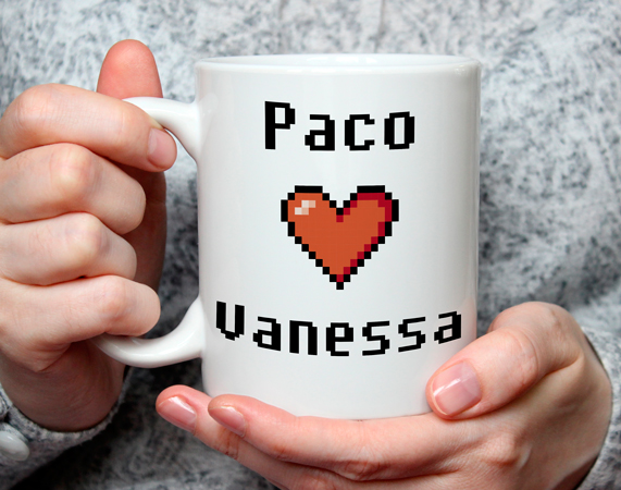 La taza personalizada más friki que podrás encontrar. Si eres fanático de los videojuegos arcaicos, no puede faltar esta taza en tu cocina. ¿Recuerdas lo divertidos que eran esos juegos? Saca una sonrisa cada mañana y desayuna con esos buenísimos recuerdos. Si tu pareja es igual que tú en este sentido, esta taza está diseñada para vosotros. Antes de pagar, os preguntaremos por vuestros nombres, y recibiréis una taza individualizada al máximo.