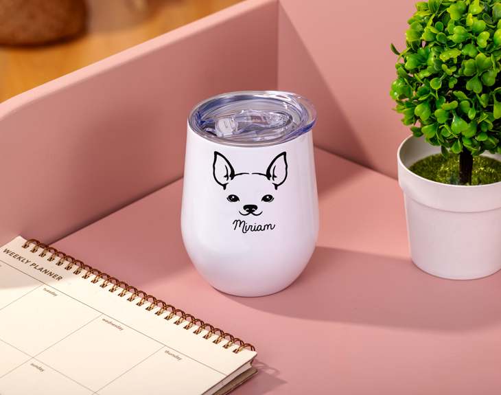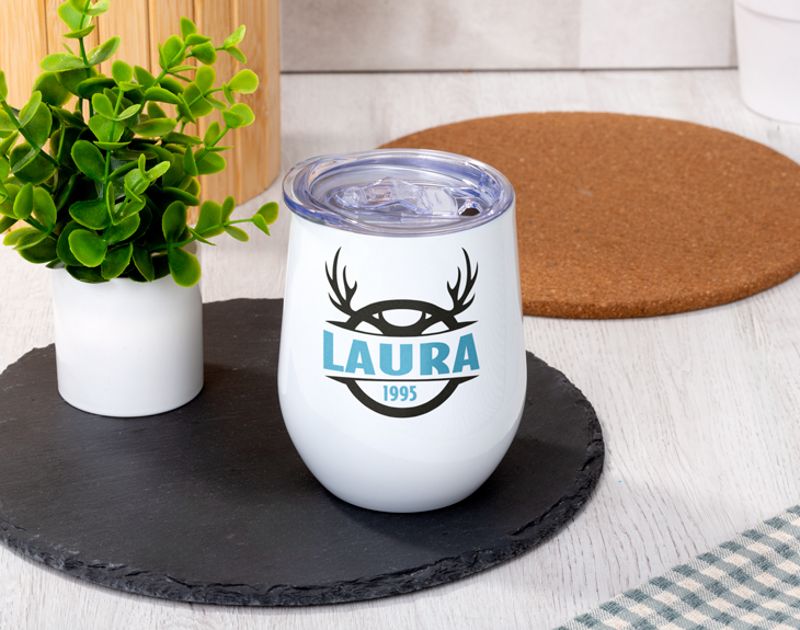 • Vaso térmico blanco personalizado. • Tarjeta recordatoria.