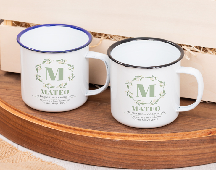 La Primera Comunión de tu hijo/a es uno de los eventos más importantes, no solo para su vida, sino también para toda la familia... ¡Y para todos los invitados a esta celebración! Esta taza enamel personalizada con motivos de comunión es perfecta para sorprenderles. ¡Así tendrán un gran recuerdo de este maravilloso día! Una taza enamel para comuniones como esta es perfecta para conquistar a todos los invitados. ¡Seguro que no se lo pasarán mejor en ninguna otra comunión! Contamos con cinco colores distintos para el borde de las tazas enamel: negro, azul, verde, rojo o plateado. ¡Podrás escoger el color que más te guste! Este regalo original para comuniones cuenta con un diseño hecho especialmente para que toda la familia recuerde este maravilloso día. Solo tendrás que escoger el número de tazas enamel que quieres y añadirlas al carrito. En el área de personalización encontrarás los dos diseños disponibles: en tonos verdes o rosas. Al escogerlo solo tendrás que clicar sobre los cuadros de texto y añadir toda la información referente a la Primera Comunión de tu hijo/a. ¡Será una jornada fantástica! IMPORTANTE: las tazas enamel son un producto vintage. Se fabrican una a una simulando ser un producto envejecido, por lo que todas tienen falsos defectos de textura y color. Está fabricada en acero inoxidable con recubrimiento de esmalte cerámico, por lo que no es una taza apta para calentar en el microondas. Medidas de la taza: 79 mm de alto x 89 mm