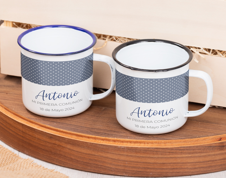¿Quieres que todos los invitados a la comunión de tu hijo/a recuerden ese día para siempre? Seguro que conseguirás sacarles una sonrisa cada mañana de su vida gracias a esta taza enamel personalizada. ¡Quedará de lo más mona tanto para decorar su casa como para beber ese riquísimo café a la hora del desayuno! Esta taza enamel para comuniones es de lo más elegante para sorprender a todos los invitados de la forma más inesperada. ¡Los detalles como este son los que marcan la diferencia! Podrás elegir el color que quieras para el borde de la taza enamel entre los colores disponibles. ¡Personaliza este regalo al máximo! Si estás buscando un regalo original para comuniones que sea único y especial, estamos seguros de que no encontrarás nada mejor que esta curiosa taza metálica con diseño de lunares. Añade el número de tazas que quieres al carrito y entra en el área de personalización para crear la taza que quieras. Elige el diseño que más te guste entre los tres disponibles, el color de taza más indicado y personaliza el diseño con toda la información referente al evento. IMPORTANTE: las tazas enamel son un producto vintage. Se fabrican una a una simulando ser un producto envejecido, por lo que todas tienen falsos defectos de textura y color. Está fabricada en acero inoxidable con recubrimiento de esmalte cerámico, por lo que no es una taza apta para calentar en el microondas. Medidas de la taza: 79 mm de alto x 89 mm