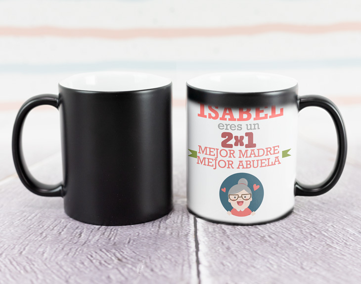 ¿Acaso existe una persona más tierna y genuinamente buena que nuestra abuela? Estas increíbles mujeres han sido las que nos han dado su cariño incondicional en cualquier momento. Estamos de acuerdo en que esas tardes de cartas y merienda no son fáciles de olvidar, ni tampoco esos banquetes que te preparaba cada vez que ibas a visitarla. Además, seguro que vuestras madres son también unas abuelas increíbles con vuestros hijos. En estos tiempos que corren, los abuelos son lo más grande que tenemos, y hay que cuidarlos siempre. Si quieres que la mejor abuela de tus hijos tenga un regalo especial este Día de la Madre, creemos que esta taza mágica personalizada la sorprenderá en todos los sentidos. Esa magnífica madre y abuela debe ser toda una joya, una mujer capaz de cualquier cosa, y que cuida a sus seres queridos de una manera especial. Gracias a este regalo original, la abu podrá desayunar de una manera única... ¡con un diseño que aparecerá mágicamente! Importante: La taza es apta para microondas. Importante: esta taza NO es apta para el lavavajillas. Puede perder el color negro de la superficie.