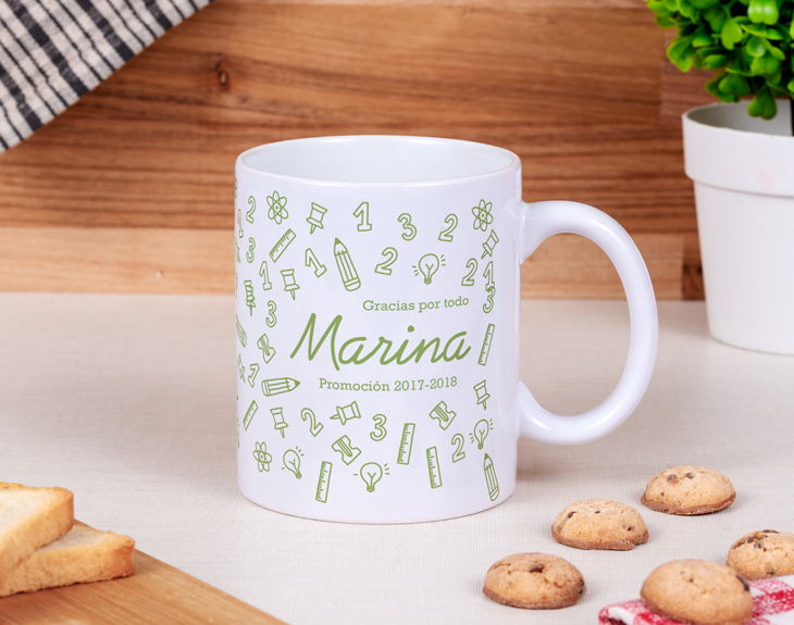 Hay valores que hacen que un profesor o profesora sea alguien único. El cariño con el que enseña, la paciencia que tiene con todos los alumnos, la vocación que muestra en cada clase... Si has tenido la suerte de tener al mejor profe del mundo, tu clase y tú podéis sorprenderle con esta taza personalizada. Es un regalo único y muy especial con el que se acordará de sus alumnos favoritos siempre que la utilice para desayunar. ¡Es un detalle precioso para fin de curso! Si como alumnos queréis agradecer todo el esfuerzo que ha hecho vuestro profe durante todo el curso, no hay mejor manera de hacerlo que con esta original taza. Su diseño es perfecto para cualquier profe porque le hará recordar todo lo que le gusta y es que todos los dibujos que hay tienen que ver con el colegio y la enseñanza. ¡Un regalo con el que se emocionará! Personalizar esta taza es súper fácil. Añade el producto al carrito, entra en el área de personalización y comienza a crear tu diseño. Podrás elegir el color del diseño (verde, azul, amarillo, rosa o multicolor) y después añadir el texto que quieras. Inspírate en la imagen o deja volar tu imaginación. Nosotros nos encargamos del resto y nos aseguramos que quede perfecta y lista para usar. ¡Se convertirá en su taza favorita! Al comprar este diseño podrás elegir el tipo de taza que quieres entre nuestras seis opciones disponibles en el desplegable: cerámica, mágica, plástico, con el interior en color, con cuchara o con asa en forma de corazón. En el lado derecho encontrarás la guía de tazas con las características de cada una de ellas. ¡Escoge el estilo y la cantidad de tazas que quieras!