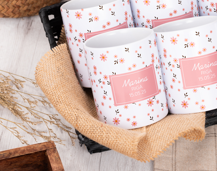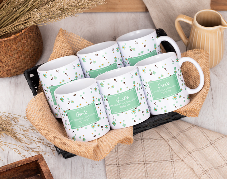 La Primera Comunión de tu hijo/a es un acontecimiento único en vuestra vida y merece una celebración que esté a la altura. Eso incluye tener un pequeño detalle con los invitados, como estas tazas personalizadas con diseño de florecitas. Sorprende a tu familia y amigos con este precioso regalo para que nunca olviden este día tan especial. Este tipo de ocasiones son perfectas para regalar este tipo de detalles a tus invitados, ya que es una forma de agradecerles su presencia y que compartan este momento tan importante con vosotros. Además, estas tazas son totalmente personalizables, porque vas a poder elegir desde el diseño hasta el modelo de taza que más te guste, creando combinaciones únicas que harán de este detalle algo muy especial. Antes de personalizar estas tazas, primero debes seleccionar cuántas unidades quieres y el tipo de taza. Después, al añadirlas al carrito podrás escoger el diseño que más te guste y añadir el texto. Nosotros nos encargamos de que todo quede perfecto y listo para triunfar en esta celebración. ¡Tus invitados se quedarán sin palabras!
