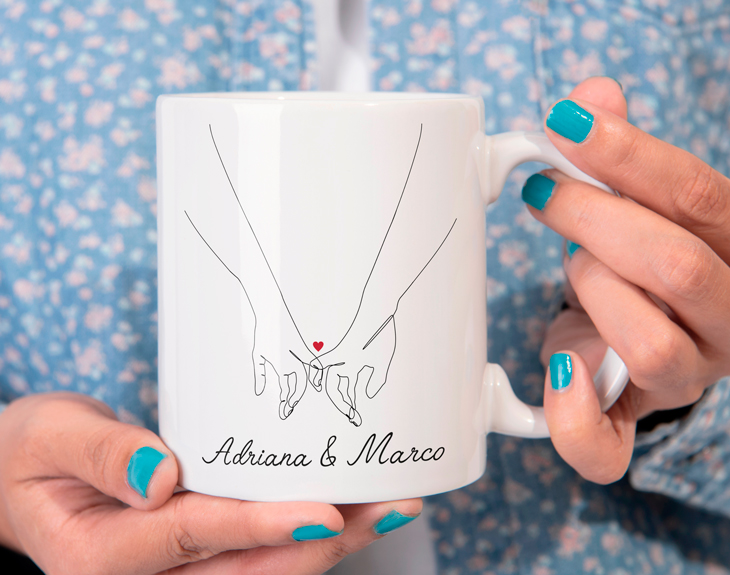 ¿Has tenido la suerte de encontrar a tu alma gemela? Si uno de los pilares de tu relación es el compromiso, está claro que tu pareja siempre cumplirá todas vuestras pinky promise. Por eso, si buscas sorprender a novia/o, nuestra taza personalizada con diseño "Pinky promise" será el mejor regalo de todos. Esta taza personalizada es ideal para disfrutar del café o té a la hora del desayuno. ¡Gracias a esta taza, conseguirás que sonría desde primera hora de la mañana! Y lo mejor es que es personalizable. ¡Podrás escribir los nombres que tú quieras! Sin duda, será un regalo perfecto para celebrar San Valentín, un cumpleaños, vuestro aniversario o para cualquier ocasión especial. ¡Triunfarás seguro! Personalizar esta taza es súper sencillo. El primer paso a seguir consiste en añadir el producto la carrito y entrar al área de personalización. Una vez ahí, ya puedes escribir los nombres que tú quieras. Pronto estará perfecta y lista para regalar. ¡Será un regalo original para enamorados! Al comprar este diseño podrás elegir el tipo de taza que quieres entre nuestras nueve opciones disponibles en el desplegable: cerámica, mágica, plástico, con el interior en color, con cuchara, con asa en forma de corazón o enamel. En el lado derecho encontrarás la guía de tazas con las características de cada una de ellas. ¡Escoge el estilo y la cantidad de tazas que quieras!