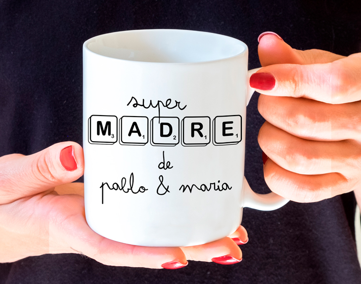 ¿Tienes a la mejor madre del mundo? La unión con nuestras madres es especial desde que nacemos y se mantiene así durante toda nuestra vida. Nos cuidan, nos protegen, nos mantienen y nos ayudan a resolver nuestros problemas, pero, sobre todo, nos ayudan a crecer en todos los sentidos. Si tu madre es la más especial del mundo, es hora de que se lo recuerdes con un regalo tan único como ella: nuestra taza personalizada Supermadre Scrabble. Nuestra taza es de cerámica y es perfecta para disfrutar de un buen desayuno cada mañana. Imitando el divertido diseño del juego Scrabble, podremos elegir entre dos tipos de diseño: Supermamá o Supermadre. Pero lo mejor de todo es que esta preciosa taza irá personalizada con el nombre de sus hijos, a los que quiere por encima de todo y que convertirán este regalo el doble de especial. Regalar una taza es perfecto cuando tenemos un presupuesto ajustado o queremos completar algún otro regalo más, pero si es personalizada, el regalo se convierte en algo mil veces más especial. Si se acerca el día de la Madre o buscas un regalo original de cumpleaños, esta preciosa taza será el detalle ideal para dejarla sin palabras.
