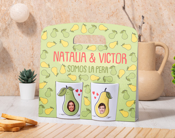 Si separados sois buenos pero juntos sois la pera, este regalo original es perfecto para dar una divertida sorpresa a tu pareja o a tu compi de aventuras. Y es que, os complementáis a la perfección, os entendéis y lo más importante, os respetáis muchísimo. Formáis el mejor equipo nunca visto y cuando estáis juntos no hay nadie ni nada que pueda pararos. Y es que, si antes de decir nada, solo con miraros ya sabéis lo que estáis pensando, es más que evidente que estáis hechos el uno para el otro. Por eso, estas tazas son geniales para que cada mañana podáis desayunar juntos y comenzar el día con una sonrisa, o mejor dicho, con una carcajada. Imagínate ver vuestras caras en una pera cada mañana, ¿no te parece de lo más divertido? Para personalizarlas necesitamos que escojas una foto de cada uno, a poder ser de vuestras caras para que sea más gracioso, y en el caso de que también quieras el estuche, que nos digáis los nombres. ¡Seguro que se muere de la risa al verlo! Medidas del estuche: 26,5 cm x 25,5 cm.