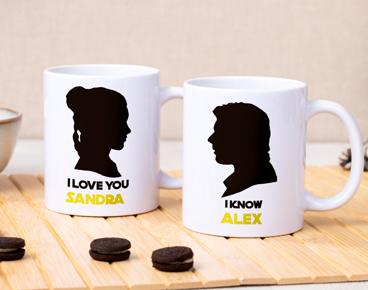Si Star Wars es vuestra pasión, y el amor de Leia y Han Solo vuestra debilidad, estas dos tazas para parejas son perfectas para vosotros. Ahora tenéis la oportunidad de convertiros en la pareja del año gracias a este regalo tan dulce y romántico. Personaliza con vuestros nombres las dos tazas y disfruta de la cara de sorpresa que pondrá tu pareja al abrir la caja. Inspirado en la escena en la que Leia le dice a Han Solo que le quiere, este diseño es perfecto para disfrutar de un amor verdadero y auténtico. ¿Tu relación de amor es impoluta? Aquí tienes el mejor regalo.
