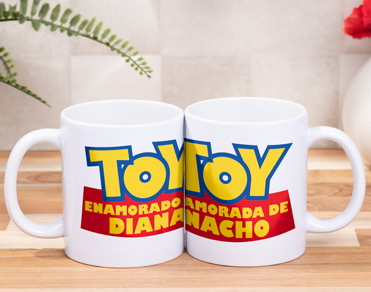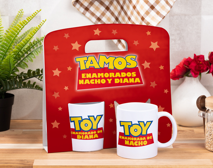 ¿Estás preparado para decirle a tu pareja que la quieres hasta el infinito y más allá? Esta es la oportunidad de oro para sorprender a esa persona que tan especial hace tu vida: tu pareja. ¿Cuántas veces has pensando en hacerla feliz para siempre? ¿Siempre has tenido claro que es tu compañera o compañero de vida? Estas tazas personalizadas son perfectas para las parejas más románticas. Si los dos estáis locos por Toy Story, no hay nada más que decir, este regalo original está diseñado para vosotros. Puedes personalizar cada taza con vuestros nombres, y además el estuche original que recogerá las dos tazas. ¡Dale una de las mejores sorpresas de tu vida! Medidas: 26,5 cm x 25,5 cm.