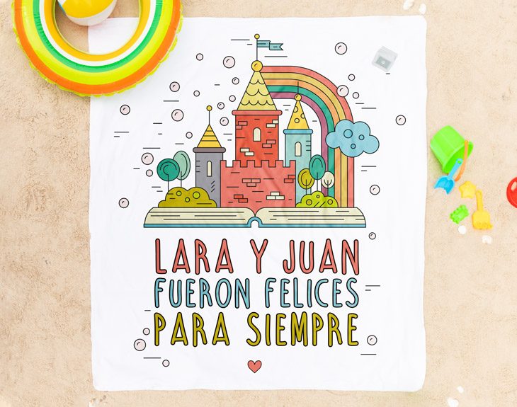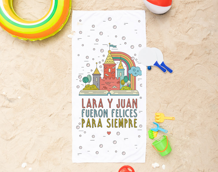 ¿Estás viviendo un amor de cuento? Si desde que conociste a esa persona tan especial estás como en una nube, esta toalla personalizada es una manera fantástica de agradecérselo. Y es que, si este verano estáis preparando una escapada romántica a la playa, con esta toalla será aún más especial. Solamente tienes que decirnos vuestros nombres para insertarlos en el diseño y tu otra mitad se quedará sin palabras. ¡No todo el mundo tiene la suerte de encontrar a su princesa o príncipe azul! Material de la toalla algodón: 100% poliéster en la parte impresa y 100% algodón en la parte inferior.