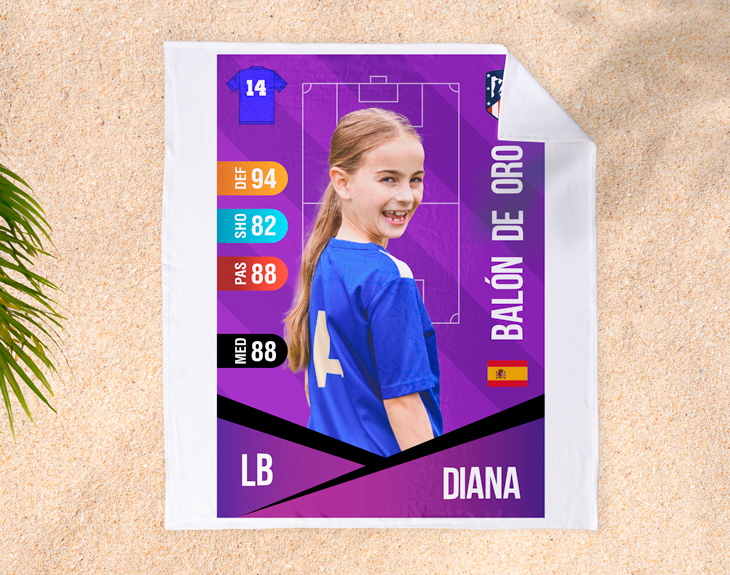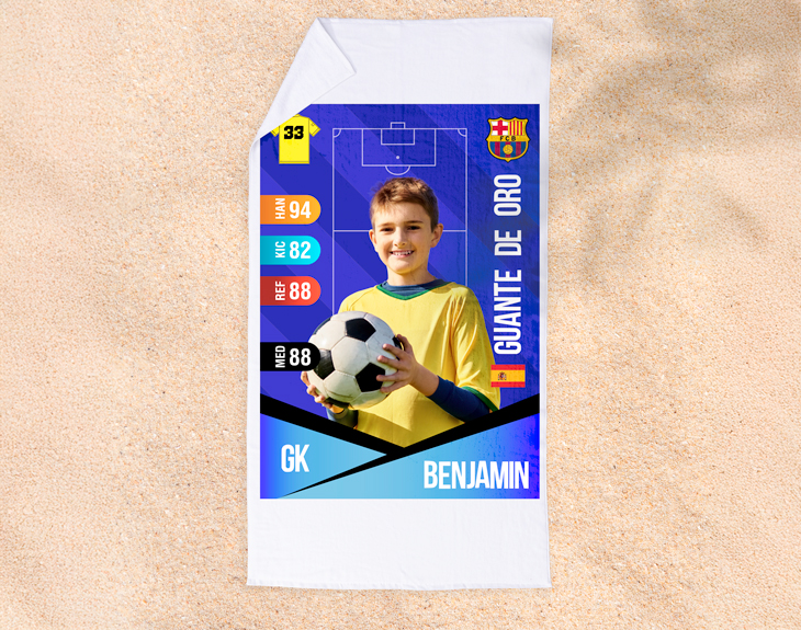 Sorprende a tu peque fanático del deporte con esta toalla personalizada con diseño de cromo de fútbol. Es un regalo original, divertido y muy práctico, ideal para niños y niñas que se pasan el día viendo partidos, jugando al fútbol y soñando con ser su jugador favorito. Podrás personalizar todos los textos y añadir una foto para que tenga su propia ficha de jugador, lo que le hará una ilusión enorme. Además de ser un detalle único, es perfecta para llevar al campamento, la piscina o la playa, y evitar así que se confunda con las toallas de los demás. ¡Nunca más volverá a perderla! Puedes elegir entre modelo individual o doble, y entre tejido de microfibra o algodón, según lo que más se adapte a tus necesidades. No te preocupes que la personalización es muy sencilla: solo tienes que añadir el producto al carrito y acceder al área de personalización, donde podrás rellenar todos los datos, incluir el nombre, escribir los textos que quieras y subir una foto. En pocos pasos tendrás un regalo original para este verano, pensado para disfrutar al máximo con los más peques. Especificaciones: - Toalla microfibra individual: 160 x 80cm. - Toalla algodón individual: 140 x 79cm. - Toalla microfibra doble: 160 x 180cm. - Toalla algodón doble: 160 x 145cm. Material de la toalla algodón: 100% poliéster en la parte impresa y 100% algodón en la parte inferior.