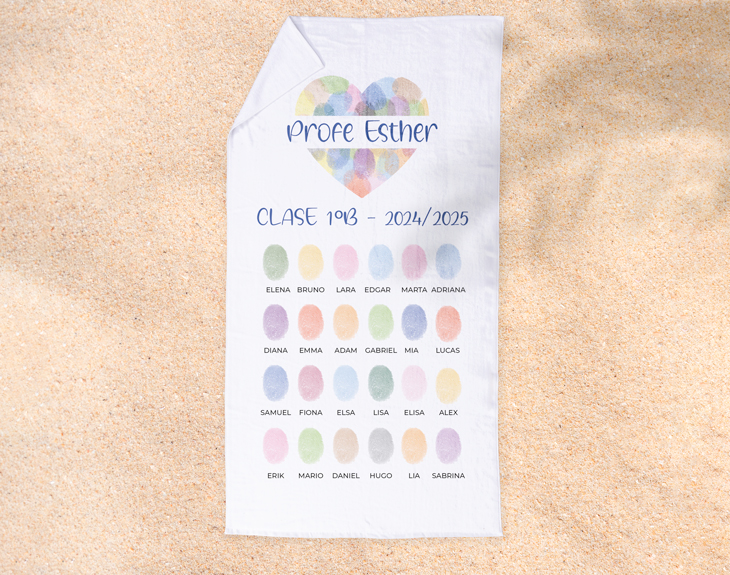 Llega el final del curso… y con él, mil recuerdos, aprendizajes y momentos compartidos con un profe que ha dejado huella. Si queréis tener un detalle que sea tan especial como práctico, esta toalla personalizada con el diseño “Huellas corazón clase” es el regalo perfecto. Un recuerdo inolvidable para esos profes que lo dan todo, cada día. Ideal para las vacaciones de verano, para la playa, la piscina o simplemente para descansar como se merece. Y lo mejor: esta toalla está personalizada con los nombres de su clase, formando un gran corazón lleno de huellitas que simbolizan el paso de cada peque por su aula. Hay disponibles dos tamaños —individual o doble— y puedes elegir entre microfibra o algodón. Además, personalizarla es muy sencillo: añade el producto al carrito, entra en el área de personalización y escribe el nombre del profe o el mensaje que más os represente. ¡Le encantará! Porque no hay mejor forma de despedirse que con un regalo que abrace el recuerdo de todo un curso. ¡Un regalo original y lleno de emoción para el mejor profe del mundo! Especificaciones: - Toalla microfibra individual: 160 x 80cm. - Toalla algodón individual: 140 x 79cm. - Toalla microfibra doble: 160 x 180cm. - Toalla algodón doble: 160 x 145cm. Material de la toalla algodón: 100% poliéster en la parte impresa y 100% algodón en la parte inferior.
