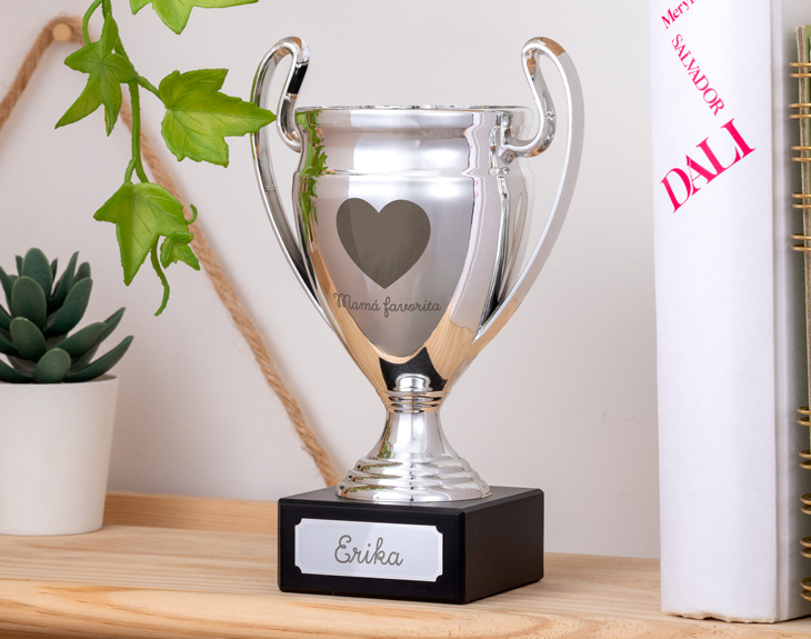Ha llegado el momento de sorprender a esa persona especial con un reconocimiento único y la mejor forma de hacerlo es con este trofeo personalizado. Este regalo es perfecto para premiarle por un montón de razones ya que podrás escribir en él ese mensaje que no quieres que esa persona olvide nunca. ¡Le encantará! Olvídate de los típicos y aburridos regalos y triunfa con este original trofeo que nadie se esperará. Porque además de ser un detalle de lo más guay, también es algo único y especial. Así, la persona que lo reciba podrá colocar este precioso trofeo donde quiera y acordarse de quién se lo regaló. Y para que sea aún más especial, vas a poder personalizar este trofeo a tu gusto. Entra en el área de personalización y elige qué diseño te gusta más, ya que tienes un montón de iconos para elegir: una estrella, un corazón, una flor... Después, añade el texto tanto en la parte superior como inferior y listo. ¡Tendrás el mejor regalo del mundo! Peso: 604 g. Medida: 20 x 13 cm (puede variar unos centímetros) Material de la copa: plástico y metal. Material de la base: mármol.