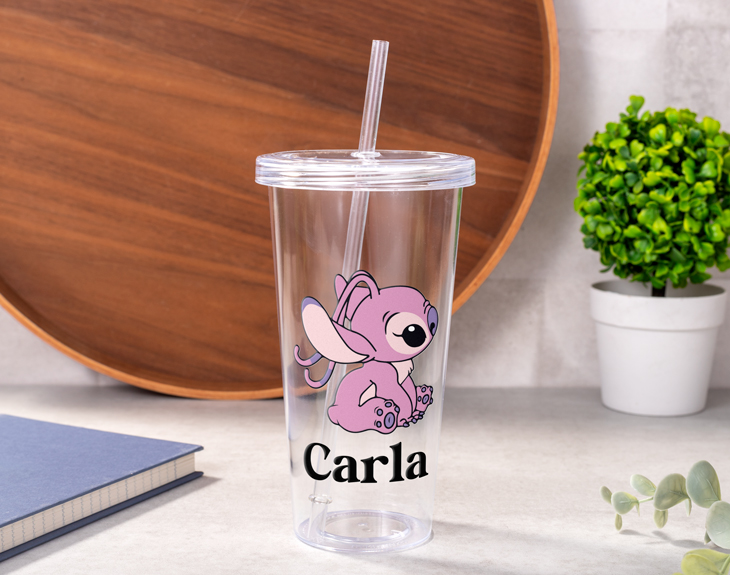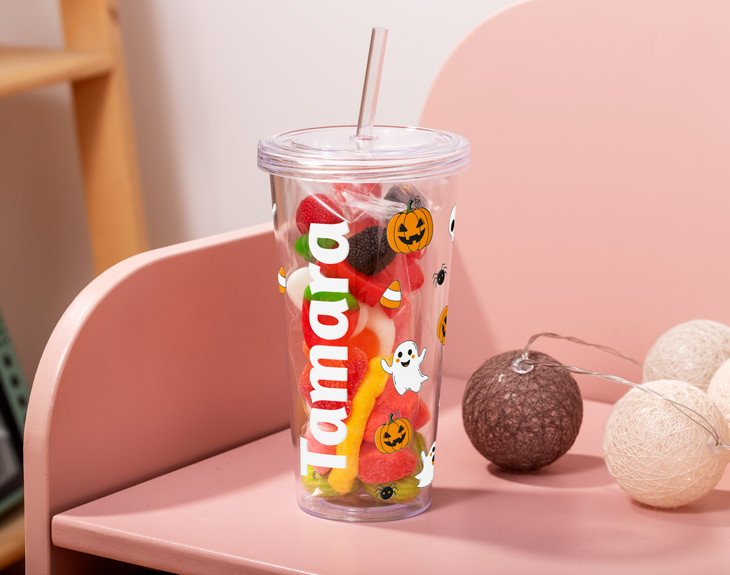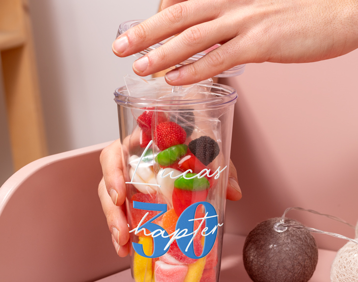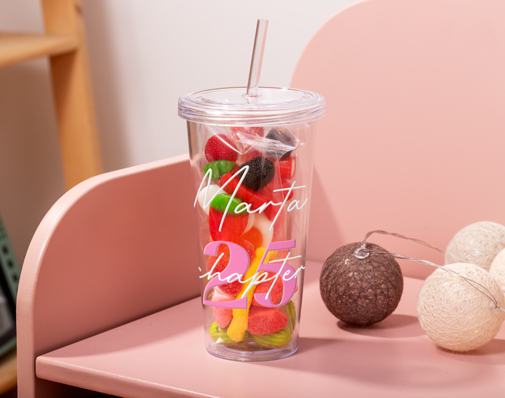 • Vaso plástico personalizado con tapa y pajita reutilizable. • 2 bolsitas de chuches. • Tarjeta recordatoria.