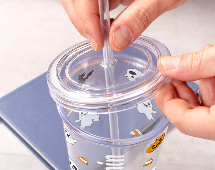 • Vaso plástico personalizado con tapa y pajita reutilizable. • 2 bolsitas de chuches. • Tarjeta recordatoria.