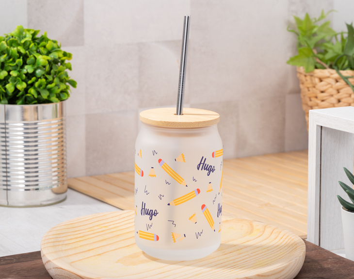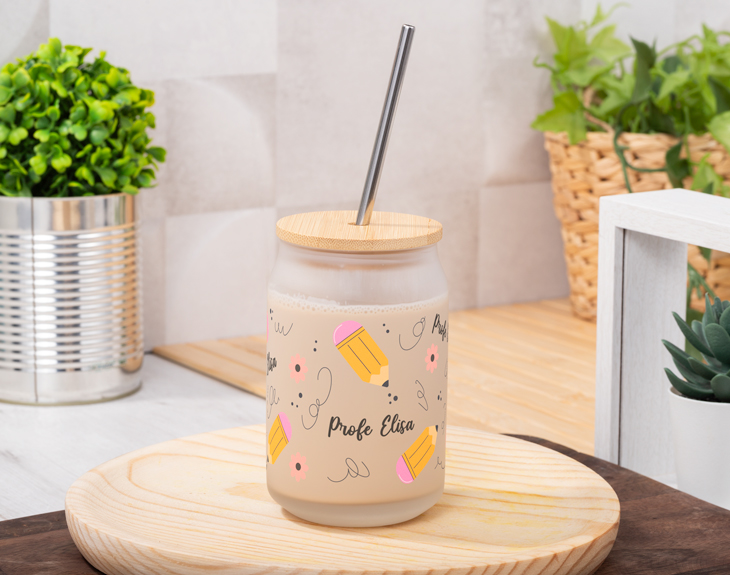 El regalo perfecto para fin de curso está aquí: un vaso con tapa y pajita personalizado con el nombre de tu profe favorito/a. Un detalle original para agradecerle por su paciencia, cariño y dedicación durante todo el año. Este original vaso cuenta con una tapa para evitar derrames y una pajita de metal reutilizable, lo que lo convierte en un regalo práctico y perfecto para disfrutar de su bebida favorita. Además, su colorido diseño lleno de lápices es personalizable, lo que te permite convertir este vaso en un detalle único con el nombre de tu profe. No habrá recibido un regalo más personal que este. Y lo mejor de todo: personalizarlo es muy fácil. Solo tienes que añadir el producto al carrito y, una vez dentro del área de personalización, podrás completar el diseño con el texto que elijas. Podrás escoger entre dos diseños diferentes y visualizar cómo quedará el resultado final del vaso. Así de sencillo y rápido, tendrás el regalo original para profes de este año. Características: - Medidas: 12,5 cm x 7,7 cm - Capacidad: 400 ml - Material: cristal mate. - Pajita: acero inoxidable.