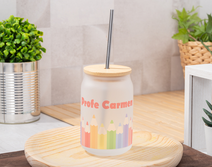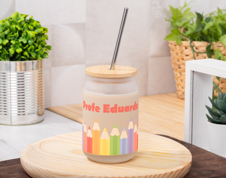 ¿Tu profe es de los que no empieza el día sin su café? Si entra a clase cada mañana con su bebida favorita en la mano, ¡tenemos el detalle perfecto para él o ella! Te presentamos nuestro vaso con tapa y pajita personalizado. Es ideal para sorprender a tu profe al final del curso y darle las gracias por todo lo que ha hecho por ti este año. Con su diseño de lápices de colores, se convertirá en un regalo único y lleno de cariño. Este vaso es perfecto para que lo lleve a clase y disfrute de su café cada mañana. Es práctico y muy cómodo, ya que incluye una tapa que evita derrames y una pajita de metal reutilizable. Y lo mejor de todo: ¡es personalizable! Podrás añadir el nombre de ese profe tan especial y convertirlo en un regalo único. Personalizar tu vaso con tapa y pajita es muy fácil. Solo tienes que añadir el producto al carrito y acceder al área de personalización. Una vez allí, escribe el nombre que quieras y... ¡listo! En unos días tendrás preparado un regalo original para profes que seguro le encantará. Características: - Medidas: 12,5 cm x 7,7 cm - Capacidad: 400 ml - Material: cristal mate. - Pajita: acero inoxidable.