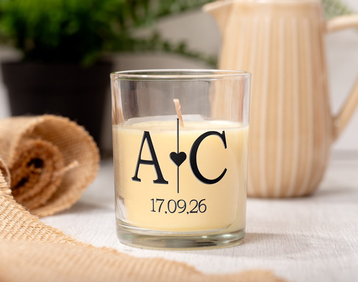 Seguro que alguna vez te has encontrado en esa situación en la que no sabes qué regalar a esa persona tan especial. No te preocupes porque tenemos la solución y es nuestra vela en vaso personalizada. Es el detalle perfecto para que esa persona pueda darle calidez a su hogar y que al colocarla en su rincón favorito tenga ese aroma que tanto le gusta. ¡Con este regalo no fallarás! Si quieres hacer el mejor regalo de cumpleaños, de aniversario o del amigo invisible, no dudes que esta original vela es justo lo que necesitas. Sin duda es el mejor adorno para decorar, iluminar y aromatizar cualquier rinconcito de casa porque quedará perfecta. Y lo mejor de todo es que podrás elegir el olor que más te guste entre los disponibles. ¡Conquistará todos los olfatos! No te olvides de personalizar esta vela con diseño porque es muy sencillo. El primer paso consiste en añadir el producto al carrito y entrar en el área de personalización. Una vez ahí, ya puedes escribir vuestras iniciales y esa fecha que os ha marcado para siempre. Nosotros nos encargamos de que quede perfecta y lista para regalar. ¡Es un regalo ideal! Medidas: -Altura: 8 cm.