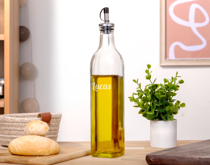 El aceite es un elemento indispensable en la cocina. Aporta sabor, textura y realza cualquier receta. Si conoces a alguien que disfruta cocinando en casa, esta aceitera de cristal personalizada es un regalo perfecto. Es práctica, elegante y muy especial. Ideal para regalar en cumpleaños, amigo invisible o en cualquier ocasión importante. Porque no es solo un utensilio de cocina, también es un detalle personal que no se olvida. Esta aceitera es resistente, cómoda de usar y muy decorativa. Gracias a su pico vertedor, se sirve el aceite sin goteos ni derrames. Además, su diseño elegante encaja en cualquier estilo de cocina. Esta aceitera de vidrio tiene algo único: se puede personalizar con el nombre o texto que tú elijas. Solo tienes que decirnos lo que quieres grabar y nosotros nos encargamos del resto. El resultado es una aceitera para cocina personalizada que sorprenderá a cualquiera. Imagina lo que sentirá esa persona al ver su nombre grabado en su propia aceitera. Un regalo original, perfecto para quienes disfrutan cuidando cada detalle en su cocina. ¿Y cómo se personaliza esta botella para aceite? Muy fácil. Añade el producto al carrito y accede al área de personalización. Escribe el nombre o frase que desees y listo. Un detalle sencillo, bonito y con un toque muy personal. Ideal para los amantes de la cocina y para quienes disfrutan de los pequeños gestos. Altura de la aceitera: 24,5 cm. Capacidad aproximada: 500 ml.