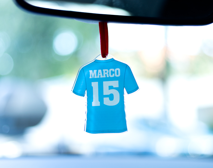 ¿Quieres tener al mejor equipo de fútbol posible en todos tus trayectos? Independientemente de si vas al trabajo, a casa o a cualquier viaje por carretera, estamos seguros de que este adorno colgante personalizado os vendrá de perlas para darle ese toque divertido y colorido a vuestro vehículo. ¡Podrá ir con los colores del equipo de fútbol del conductor! Da igual si en casa sois más del Madrid, del Barça o del Atlético de Madrid. ¡Este original adorno de metacrilato para el coche os acompañará en todas vuestras aventuras! Así todo el mundo sabrá de qué equipo sois. Este adorno está hecho de metacrilato y cuenta con unas medidas de 8 centímetros de longitud por 9 centímetros de alto. ¡Incluye una cuerda para poder colgarlo del espejo! Y lo mejor es que no solo puede aparecer el nombre de los míticos futbolistas. ¡También podrá aparecer el vuestro en este regalo original para futboleros! A la hora de personalizarlo solo tendréis que añadir el producto al carrito y acceder al área de personalización. Ahí podrás escoger entre nuestras tres opciones de camiseta: color liso, con rayas negras o con rayas blancas. ¡Escoge la que más te gusta y pon el color de fondo que quieras! Escribe el nombre y el número y crea tu propia camiseta de fútbol. Medidas: 9 x 8 cm. Material: metacrilato.