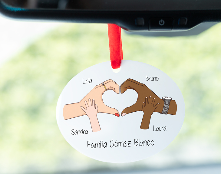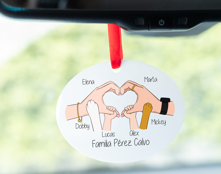 Seguro que te pasas muchas horas a lo largo de la semana dentro del coche, de aquí para allá, sin parar. Ir de casa al trabajo y del trabajo a casa, pero también a hacer la compra, al gimnasio, a buscar a los niños al cole... ¡a veces parece que vivimos en el coche! Este adorno colgante de metacrilato le dará un toque de lo más especial a tu vehículo, y además te hará recordar a tu familia en todo momento gracias al diseño que tiene: ¡unas preciosas manos formando un corazón con todos los miembros de la familia! Si queréis decorar el coche familiar con el mejor accesorio del mundo, necesitáis este original adorno para el coche. Es el regalo perfecto para todas las familias que quieren decorar su coche con algo muy especial. Además, este adorno está hecho de metacrilato y quedará perfecto colgado debajo del espejo retrovisor interno. El diseño irá impreso en él y podrás crearlo a tu manera. ¡Todo el mundo querrá uno igual! Para hacer que este accesorio sea único y diferente de cualquier otro, tendrás que personalizar este adorno de metacrilato a tu medida. Entra en el diseñador y crear a tu familia en este diseño tan emotivo. Podrás añadir todos los detalles necesarios para que os representen por completo. Y ya estará listo para recorrer junto a ti y tu familia muchos kilómetros. Importante: Podrás crear el diseño desde cero, eligiendo todos los detalles necesarios (color de la piel, accesorios para las manos, mezclar manos con patitas de gato o perro, pintar las uñas) Medidas: 11,5 x 9 cm.