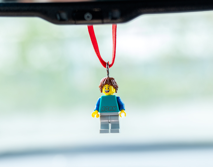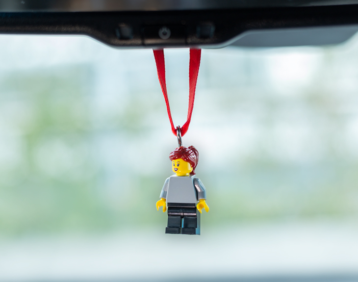 • Adorno colgante para coche Minifigura Lego. • Tarjeta recordatoria.