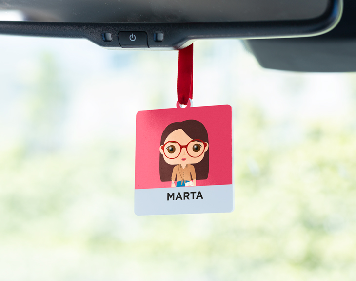 • Adorno de metacrilato para coche. • Tarjeta recordatoria.