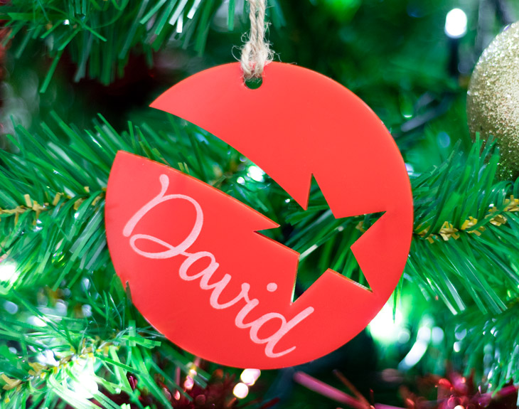 • Adorno de metacrilato rojo para árbol de Navidad. • Tarjeta recordatoria.