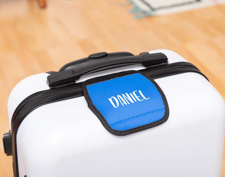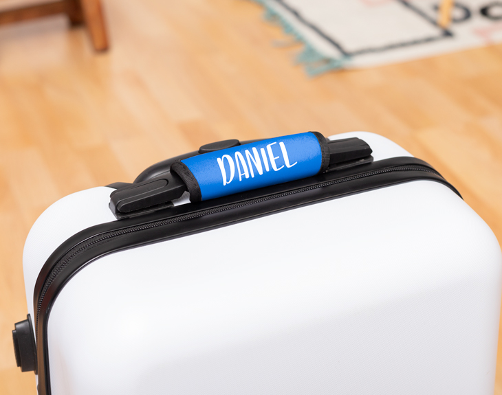 Identificad rápidamente vuestras maleta con estos agarres de maletas personalizados de neopreno. El regalo perfecto para esas personas que se pasan el día viajando, y es que, además de ser ideal para saber cuál es su maleta, es muy cómodo para transportar su equipaje. Se trata de una envoltura de neopreno con su nombre, que se ajusta perfectamente a cualquier tipo de asa, ya sea de mochila o de maleta. Ligera y muy cómoda se convertirá en el accesorio indispensable para sus viajes. ¡Seguro que está deseando estrenarla! Además, cuenta con un sistema de cierre de velcro para que pueda quitarlo y ponerlo siempre que quiera. Para personalizarlo, basta con que nos digas su nombre, nosotros nos encargamos de incluirlo en el agarre, teniendo así detalle único, personal y muy práctico. ¡Le encantará! Medidas: 8,5x7,5 cm.