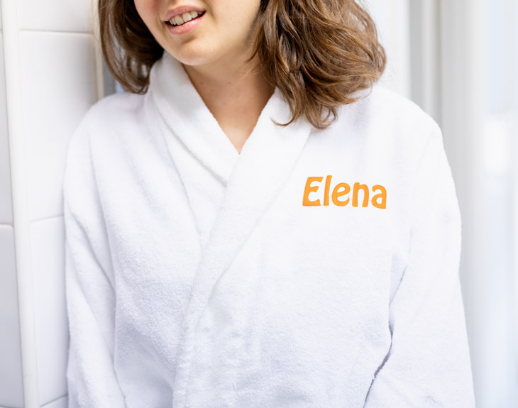La personalización de este albornoz, como os comentamos, se realiza mediante el bordado del nombre en la espalda del producto, un acabado que recuerda al que usan en sus batas las estrellas de cine y que le da un toque muy glamuroso y especial a nuestro albornoz.