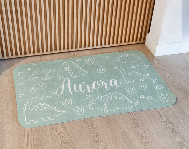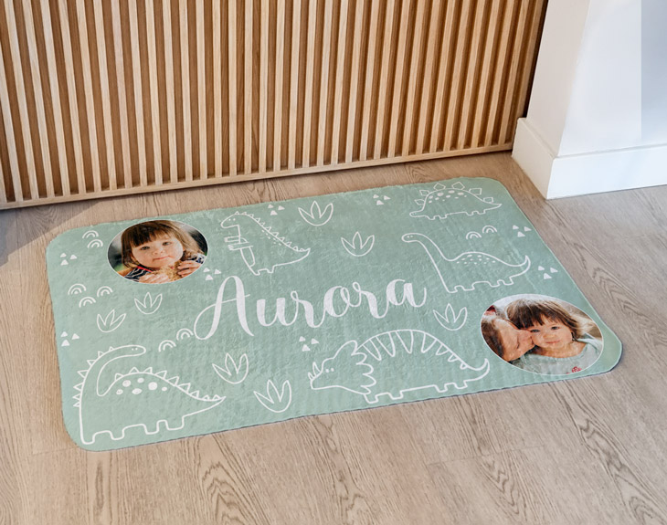 Una alfombra es el mejor complemento para decorar cualquier estancia de nuestro hogar y darle un toque de lo más especial. Una alfombra consigue darle un toque diferente a esos rincones que están un poco vacíos y en los que queremos poner algo único y que consiga definir la personalidad de nuestra casa. Esta alfombra rectangular personalizada le dará un toque muy acogedor a cualquier habitación, por eso si estás pensando en poner una alfombra nueva en tu casa, esta es la mejor opción que puedes elegir. Esta original alfombra puede ser el regalo perfecto para los más peques, será genial para decorar su habitación y que se vea única. Con este detalle, conseguirás sorprender a todos los niños en una fecha tan especial como su cumpleaños o cualquier otra celebración especial. Su diseño lleno de siluetas de dinosaurios y con un color verde pastel de fondo, es ideal para darle un toque diferente a la habitación y que encaje con todas las decoraciones. Les encantará jugar sobre ella, porque es súper suave y cómoda. Pero espera porque todavía no hemos terminado, no te olvides que antes de recibirla tienes que personalizar tu alfombra. Podrás elegir dos personalizaciones distintas: en la primera solo tendrás que añadir y colocar el nombre que quieras y en la segunda podrás añadir el nombre que quieras y tus dos fotos favoritas para tenerlas siempre de recuerdo. ¿Con cuál te quedas? Seguro que todo el mundo querrá una igual. Material: fibra sintética extra-suave y antideslizante por la parte de abajo. Medidas del ancho de la alfombra: Grande: 104 x 65 cm. Mediana: 90 x 56 cm.