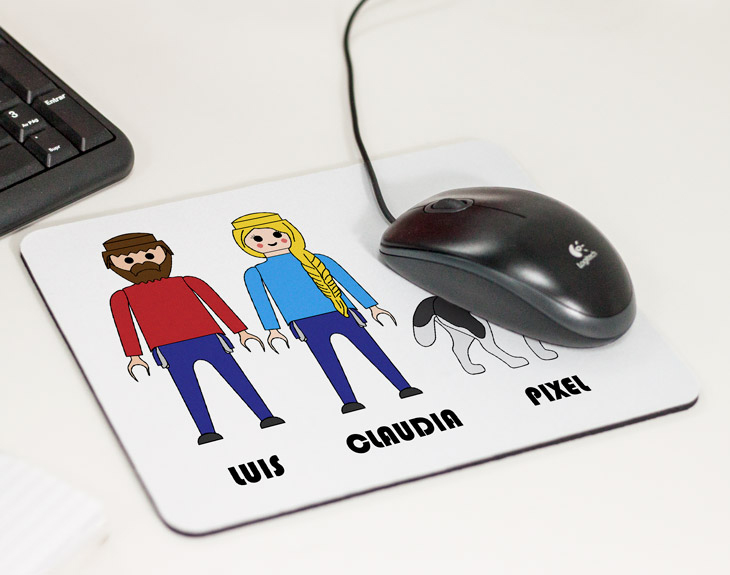 Deja sin palabras a esa persona con la que tantas tardes jugando a los Playmobil has compartido. Y es que, si desde muy pequeños siempre habéis sentido una cierta predilección por estos divertidos juguetes, ha llegado el momento de hacerse con esta alfombrilla personalizada tan especial. Solamente tienes que escoger a los personajes que más se parezcan a vosotros y decirnos vuestros nombres. De esta manera, incluso cuando esté horas y horas trabajando delante del ordenador podrá desconectar un poco. ¡Seguro que le encanta! Importante: a partir de 6 personajes irán distribuidos en dos filas. Es decir: - Familia de 6 personajes: 3 en la fila superior, y 3 en la inferior. - Familia de 7 personajes: 4 en la fila superior, y 3 en la inferior. - Familia de 8 personajes: 4 en la fila superior, y 4 en la inferior.