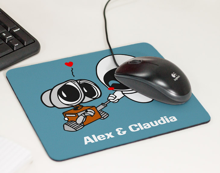 ¿Tu otra mitad se pasa el día trabajando con el ordenador?¿Quieres hacerle un regalo muy original que además de ser emotivo sea también útil? Entonces esta alfombrilla para ratón personalizada tiene su nombre. Y es que estará deseando llevársela a la oficina y poder presumir delante de todos sus compis de la suerte que tiene por estar contigo. ¿No te parece una idea fantástica? Además, lo mejor de todo, es que después de horas delante del ordenador, en esos momentos de bloqueo, esta alfombrilla le cargará las pilas y se pondrá muy pero que muy feliz. Solamente tienes que decirnos vuestros nombres para que podamos insertarlos debajo de estos tiernos dibujos de Wall-e y Eva. Porque si vuestro amor, al igual que el suyo no entiende de límites ni barreras, este diseño está hecho para vosotros.