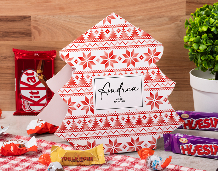 Si ahora que llega la Navidad, una de las cosas que más disfrutas es de decorar tu casita. Tenemos el mejor adorno navideño de todos, ¡nuestro arbolito de cartón “Jersey navideño”! Y lo más guay: es personalizable, puedes escribir el nombre que tú quieras. Nuestro adorable arbolito de cartón es una auténtica caja de sorpresas. Por fuera es un árbol de Navidad en miniatura hecho de cartón y dentro está lo mejor: el chocolate. Esta caja de chocolatinas está pensada para los amantes del dulce. ¡Podrás elegir el relleno que más te guste! Solo queda personalizar este arbolito de cartón. El primer paso a seguir consiste en añadir el producto al carrito y entrar al área de personalización. Una vez ahí, ya puedes escribir el nombre que tú quieras. Pronto quedará perfecto y listo para regalar. ¡Un original regalo navideño! Relleno del arbolito (según la opción elegida): • Relleno Huesitos: 9 barritas de Huesitos. • Relleno Toblerone: 20 mini Toblerone surtido. • Relleno Kit Kat: 4 paquetes de Kit Kat. • Relleno Kinder: 30 chocolatinas Kinder (10 Schokobons, 10 Kinder mini, 10 Kinder bueno mini) • Relleno chocolatinas con almendras: 11 barritas de turrón. • Relleno surtido de chocolatinas: Mix surtido de las chocolatinas más deliciosas. Medidas: 20 cm x 20 cm x 9 cm. Material: cartón plegable.