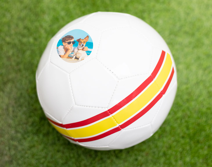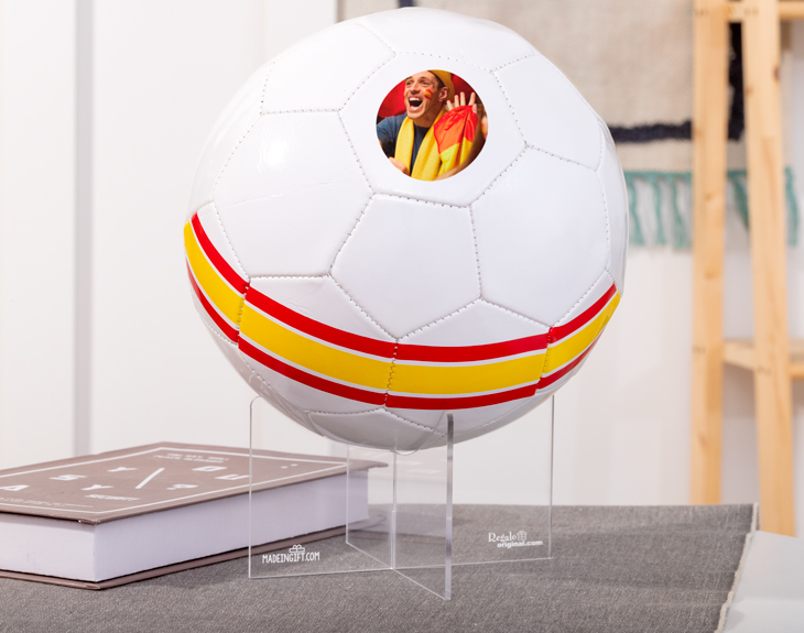 Nuestro balón personalizado para los auténticos seguidores de la Selección Española de Fútbol. Si estás deseando ver con el balón a Sergio Ramos, Isco, Busquets, y a todos los jugadores de la Selección, este balón original está diseñado para ti. Si tu hijo o hija es seguidora de la Selección, dale una sorpresa enorme. ¡Se pondrá a darle patadas al balón enseguida! Solo tendrás que buscar una foto especial, y nosotros la imprimiremos en el balón, dejándolo como se ve en la imagen. ¡Es un regalo perfecto para sorprender a los más futboleros! Material: PVC Grosor del PVC: 1,6 mm Medidas: 25cm Peso: 260 - 280 gramos