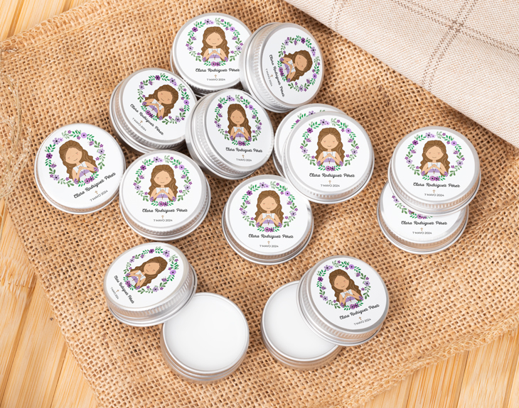 ¡La Primera Comunión es una de las fechas más importantes para un niño! Es una fecha en la que se reúnen todos los familiares y amigos, por eso todo tiene que salir a la perfección. Si quieres tener un detalle con todos los invitados que asistan a este gran evento, nuestros bálsamos labiales personalizados serán el recuerdo perfecto. Este bálsamo es de origen 100% vegetal, con una aroma a vainilla. Este tarrito es de aluminio con la tapa a rosca y un acabado metalizado. Pero lo mejor es que es personalizable, podrás escribir el nombre del protagonista y el lugar de la ceremonia. ¡Quedará genial! Personalizar este bálsamo es muy sencillo. El primer paso a seguir consiste en añadir el producto al carrito y entrar al área de personalización. Una vez ahí, ya puedes poner los datos de esta ceremonia. Pronto estará perfecto y listo para regalar. ¡Será un regalo original para comuniones! Medidas: Diámetro: 4 centímetro. Alto: 1,5 centímetro.