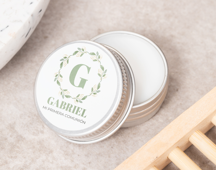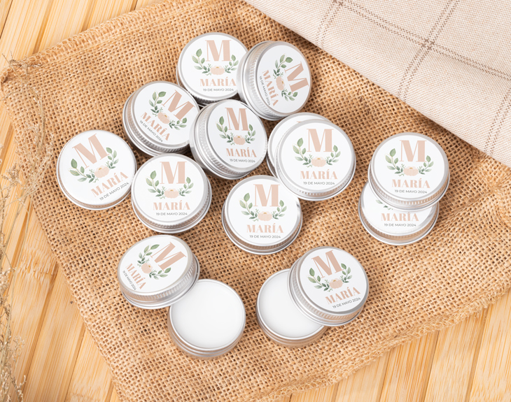 ¿Se acerca la Primera Comunión del más peque de la casa? Está claro que va a ser una fecha súper especial en la que se juntan todos los familiares y amigos, por eso tiene que salir todo a la perfección y estar bien organizado. Si quieres tener un detalle con todos los invitados que asistan a esta celebración, nuestros bálsamos de labios personalizados será el detalle perfecto. Y es que un día tan especial como este se merece tener un recuerdo igual de único y para eso nuestros bálsamos labiales son un detalle perfecto para que nunca se olviden de este día tan bonito. Este bálsamo es de origen 100% vegetal, con una aroma a vainilla. Este tarrito es de aluminio con la tapa a rosca y un acabado metalizado. Lo más especial es que es son personalizables, podrás escribir el nombre del protagonista y el lugar de la ceremonia. ¡Quedará genial! Personalizar este bálsamo es muy sencillo. El primer paso a seguir consiste en añadir el producto al carrito y entrar al área de personalización. Una vez ahí, ya puedes poner los datos de esta ceremonia. Pronto estará perfecto y listo para regalar. ¡Será un regalo original para comuniones! Medidas: Diámetro: 4 centímetro. Alto: 1,5 centímetro.