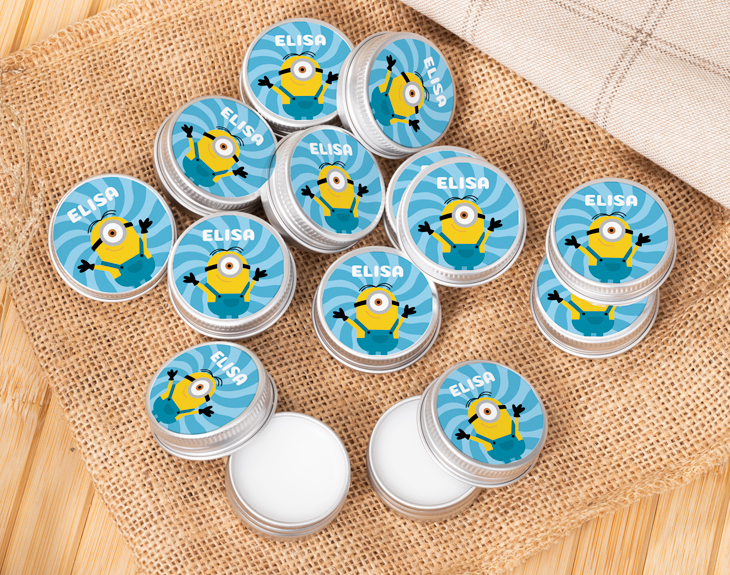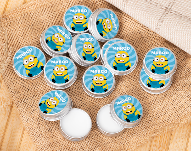 ¿Se acerca el cumple del peque de la casa? Si le estáis organizando una fiesta para celebrar que se hace mayor, está claro que no puede faltar de nada. Ya que cumplir años siempre nos hace muchísima ilusión cuando somos más jóvenes. Y nosotros tenemos el detalle perfecto, nuestro bálsamo labial personalizado con diseño "Minions" es ideal para sorprender a los invitados del cumpleaños. Además, si los personajes favoritos del hijo son los minions, este bálsamo labial está diseñado expresamente para él o ella. Porque tiene un estampado inspirado en los minions de "Gru, mi villano favorito", y lo mejor es que es personalizable, podrás escoger al minion que más te guste y escribir el nombre del cumpleañero. ¡Le encantará! Personalizar este bálsamo labial es súper sencillo. El primer paso a seguir consiste en añadir el producto al carrito y entrar al área de personalización. Una vez ahí, ya puedes escoger el personaje de la peli que más te guste y escribir el nombre del cumpleañero. Pronto estará perfecto y listo para regalar. ¡Será un original regalo para cumpleaños! Medidas: Diámetro: 4 centímetro. Alto: 1,5 centímetro.