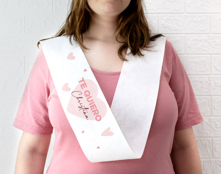 Ha llegado el momento de que todo el mundo se entere de lo muchísimo que quieres a esa persona, ¿y qué mejor manera de demostrarlo que con una banda personalizada tan emotiva como esta? ¡Dinos su nombre y tendrá el regalo más romántico de todos! Para personalizarla, basta con que nos digas su nombre y nuestro diseñador se encargará de incluirlo en este precioso diseño lleno de corazones. Además, si pinchas sobre "ver más diseños" podrás escoger el color que más te guste, así será totalmente a medida. ¿Te imaginas la cara que pondrá cuando la vea? Si se acerca su cumpleaños, vuestro aniversario, vuestra boda o cualquier otra fecha especial, esta banda no puede faltar. Y es que, la protagonista o el protagonista de día se merece un detallazo así para no olvidar nunca lo importante que es para ti. Además, así podrá guardar para siempre un precioso recuerdo de ese momento tan inolvidable. Medida: 140 x 9,5 centímetros. Material: Poliéster