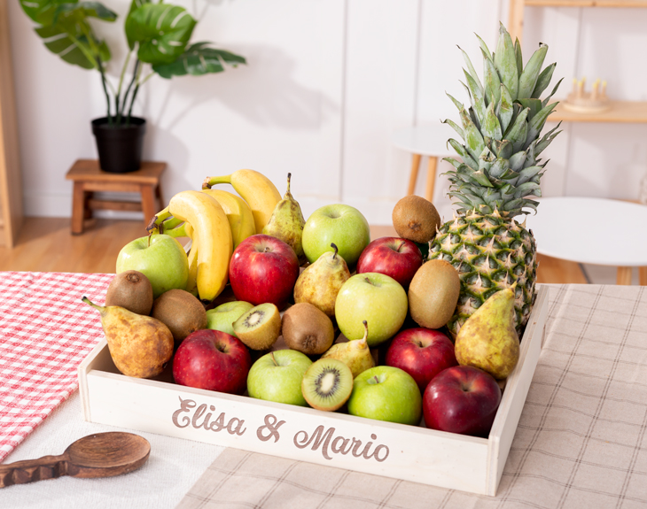 La bandeja de fruta Clásica te brinda las mejores frutas mediterráneas y tropicales, presentadas en una robusta bandeja de madera que podrás utilizar siempre que quieras. Es un regalo original, fresco y lleno de vitaminas. La bandeja se puede adquirir en tres modalidades: sin personalizar, con un texto grabado a láser en el lateral o con una fotografía impresa en la base. Nuestro equipo selecciona en mercados de proximidad las mejores piezas, para que la persona que reciba este regalo se sienta tan especial como merece.